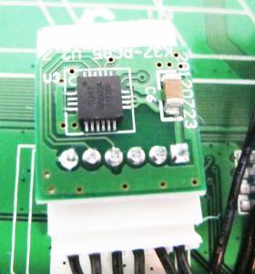 It’s glued to a little block of styrofoam. Looking at the board itself, I think that the accelerometer was initially glued or soldered to the board. But it is now raised about 1 cm, and attached to the board with a short cable. I did not decipher the part number, but it looks like a generic accelerometer.