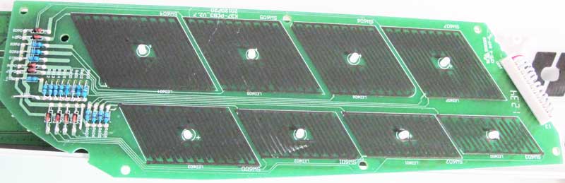 The other side of the board is more interesting. Again, it is covered with resistive traces for the soft switches. The touch sensor is in the middle. It is quite sensitive and has a nice “slip”. By that I mean that the surface of the sensor (some kind of plastic) is not extremely smooth: just enough of a texture to let a (sticky) finger slide while providing a little feedback. There is a small potentiometer above the touch sensor. It is used to adjust the sensitivity of one of the sensors (or the zero-at-center of the pitch bend wheel).