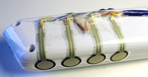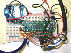 I’m combining the data from the sensors with the Midi data coming from the Vortex. I use a Teensy++ 2 for the prototype. It’s programmable in the Arduino environment, has a flexible port definition and is fast. The data is sent wirelessly using an XBee radio (see this post). I can operate all this using a 1.5 Volt battery and a voltage booster (Jeelab’s AA board) but the current draw is quite high (about 60 mA at 3.3 V, so well over 150 mA at the battery), so it’s better, and nearly as compact, using two (or three) AA batteries.