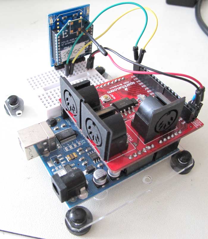 On the receiving side, I used another XBee connected to an Arduino and I used an Arduino, a Sparkfun Midi Breakout board,