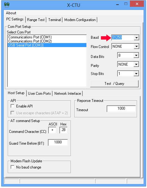 Note: In the LadyAda article, there is a section that explains how to replace the FTDI driver required to program the XBee to work at 31250 bauds-per-seconds. If you use Windows 8, there is no need to do this. When you install the X-CTU program from the XBee maker’s site (Digi.com), Windows 8 will recognize the FTDI chip and allow you to change the baud rate (using the method described in the ladyada article). Then, all you have to do is change the X-CTU program’s baud rate by typing “31250” directly in the Baud field: